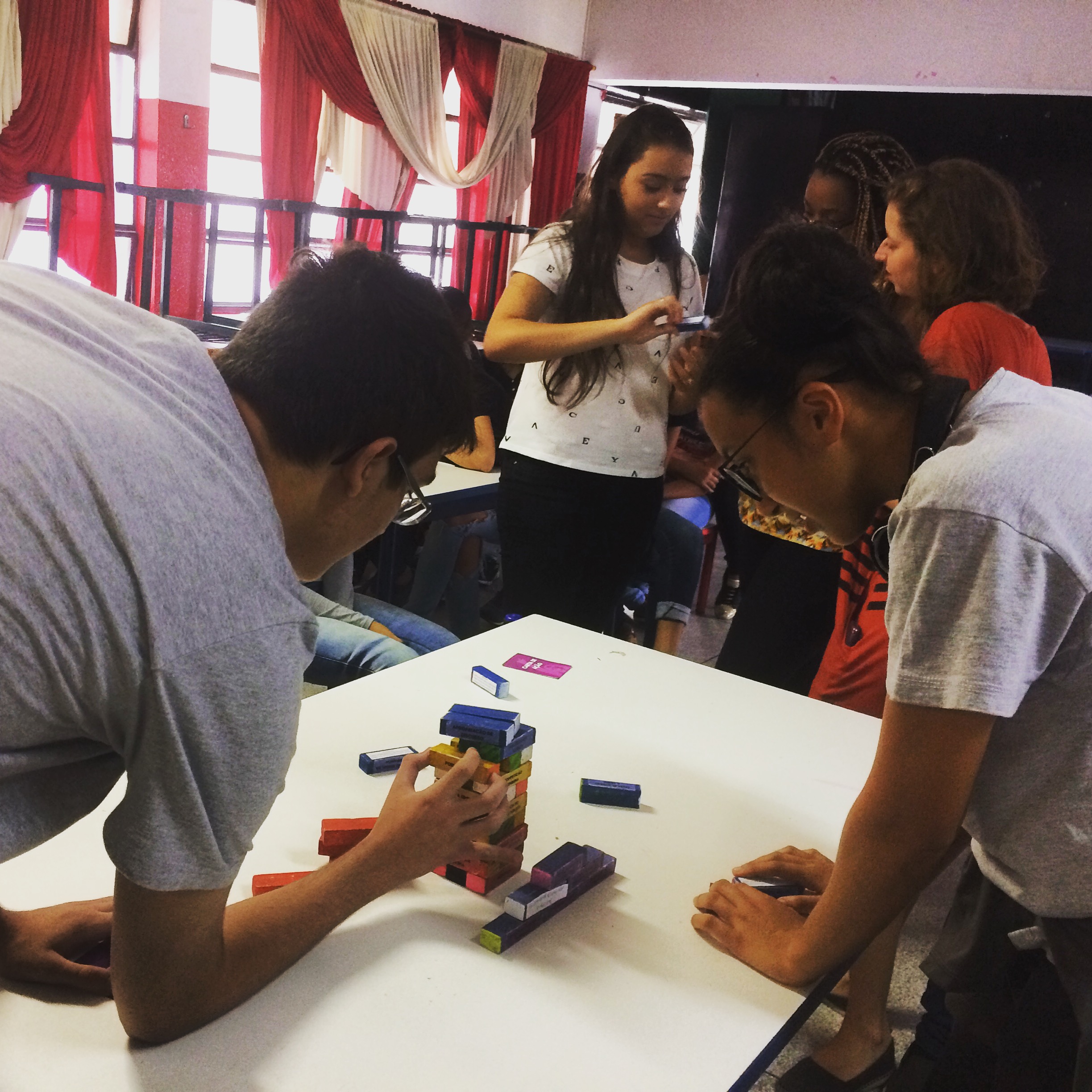 Com a discussão iniciada, foi hora de começar a jogar “A Queda do Patriarcado”. O jogo consiste em ir desmontando um pilar composto por blocos – cada um representando uma questão específica de desigualdade de gênero da nossa sociedade – e ir refletindo sobre as questões: falta de acesso a cargos altos, desigualdade salarial, feminicídio, pornografia, entre outras.